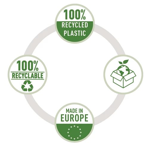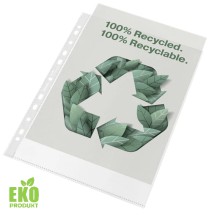 Ekologická kapsa na dokumenty A4 pro každodenní použití vyrobená ze silného 100% recyklovaného plastu (průmyslový odpad/odřezky nebo zbytky z výroby: externě testováno UL). Univerzální multi perforace umožňuje pohodlné ukládání dokumentů do pákových a kroužkových pořadačů. Celý produkt lze znovu použít a recyklovat. 100 kusů euro obalu zabaleno v kartonové krabici, která je také 100% z recyklovaného materiálu a recyklovatelná. Vyrobeno v Evropě.