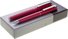 Dárková sada s červenou propiskou a rollerem v dárkové papírové krabičce. Laser na propiskách je lesklý stříbrný. Kolekce GB.