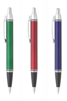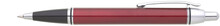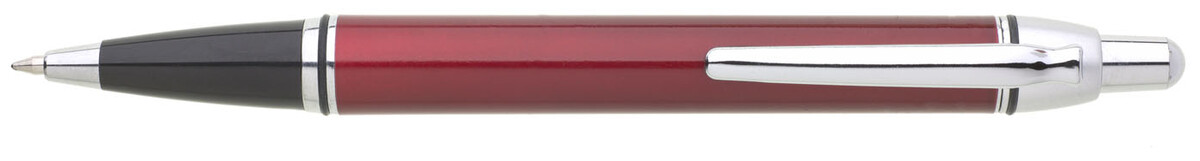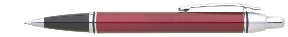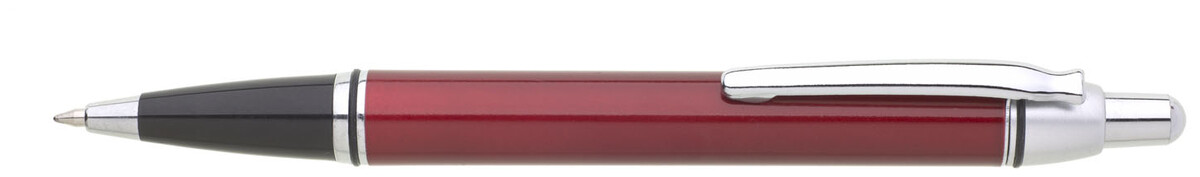 Červená metalická propiska je doplněna černou špičkou a stříbrnými doplňky. Náplň velkoobsahová, modře píšící.
