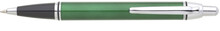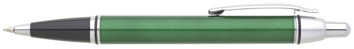 Zelená metalická propiska je doplněna černou špičkou a stříbrnými doplňky. Náplň velkoobsahová, modře píšící.