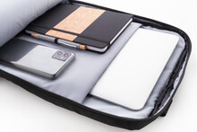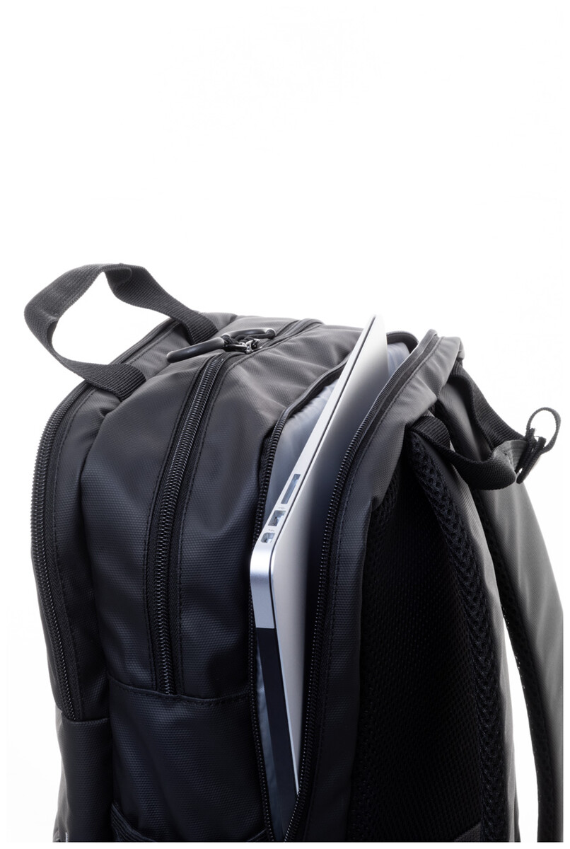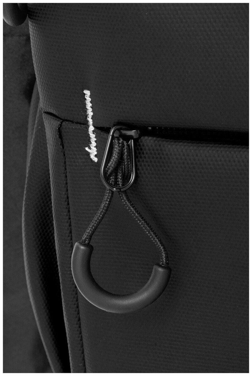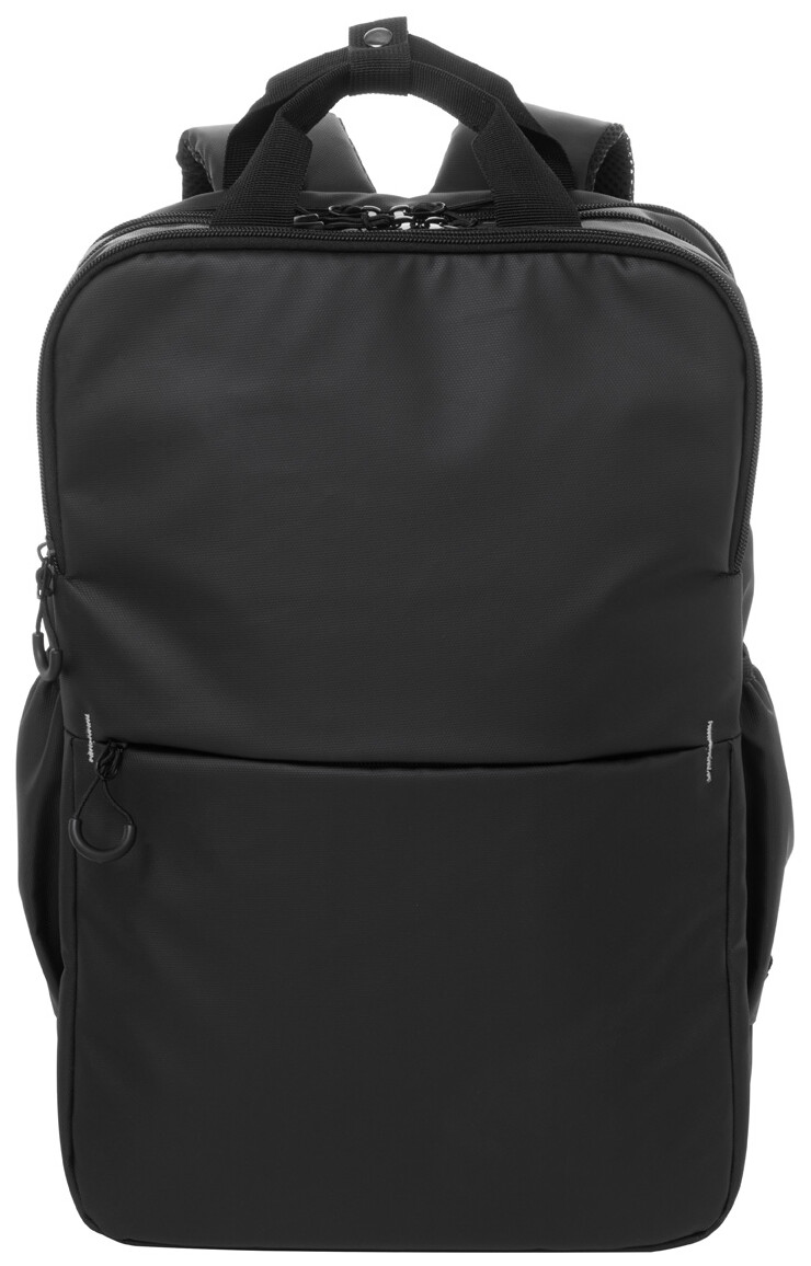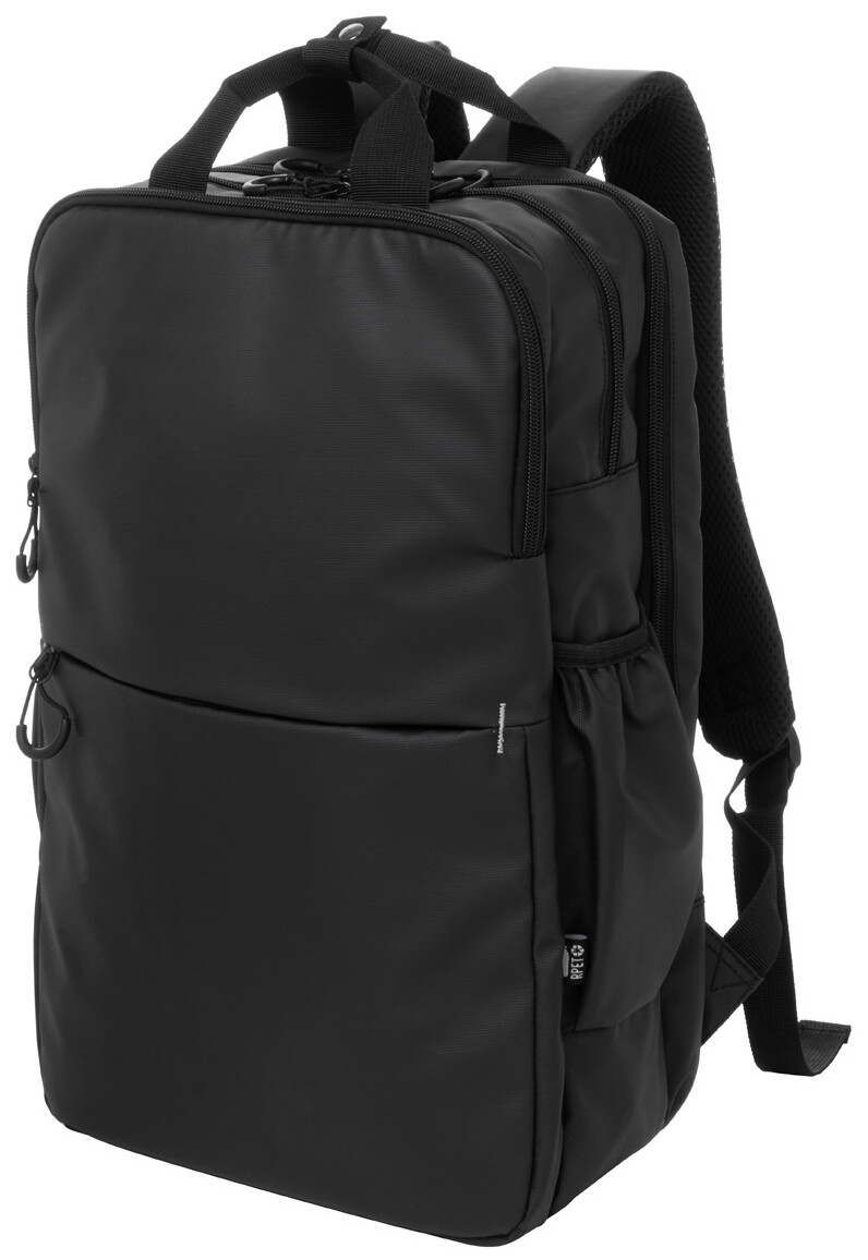 Vodotěsný batoh RPET se 2 přihrádkami na zip, 2 předními kapsami na zip, bočními kapsami a polstrovanou přihrádkou na notebook (16"). S popruhem na vozík, polstrovanými zády a ramenními popruhy. Polyester 600D RPET potažený PU, s výrazným štítkem RPET.