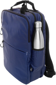 Vodotěsný batoh RPET se 2 přihrádkami na zip, 2 předními kapsami na zip, bočními kapsami a polstrovanou přihrádkou na notebook (16"). S popruhem na vozík, polstrovanými zády a ramenními popruhy. Polyester 600D RPET potažený PU, s výrazným štítkem RPET.