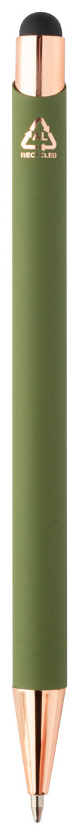 Kuličkové a dotykové pero z recyklovaného hliníku s pogumovaným povrchem a detaily v barvě růžového zlata. Se speciální povrchovou úpravou pro zrcadlové laserové gravírování v barvě růžového zlata. S modrou náplní.