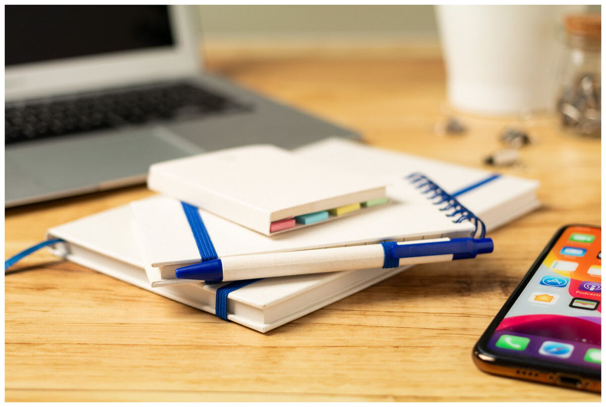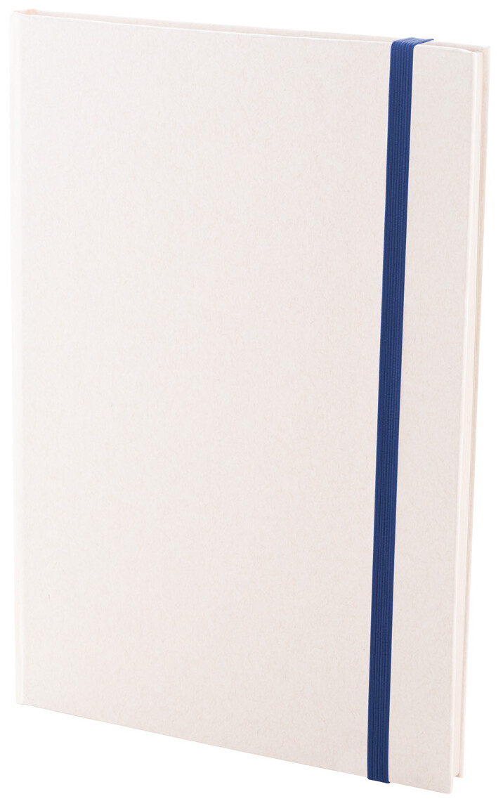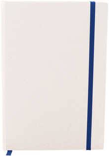 Blok A5 z kartonu z recyklovaného mléka s pevnou vazbou, 80 linkovanými listy a elastickým páskem v odpovídající barvě.