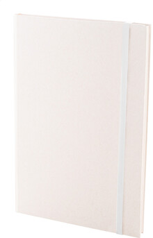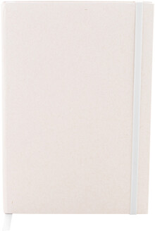 Blok A5 z kartonu z recyklovaného mléka s pevnou vazbou, 80 linkovanými listy a elastickým páskem v odpovídající barvě.