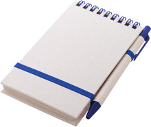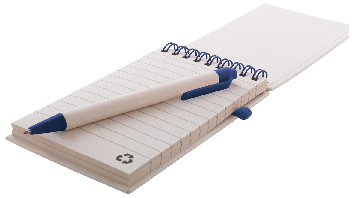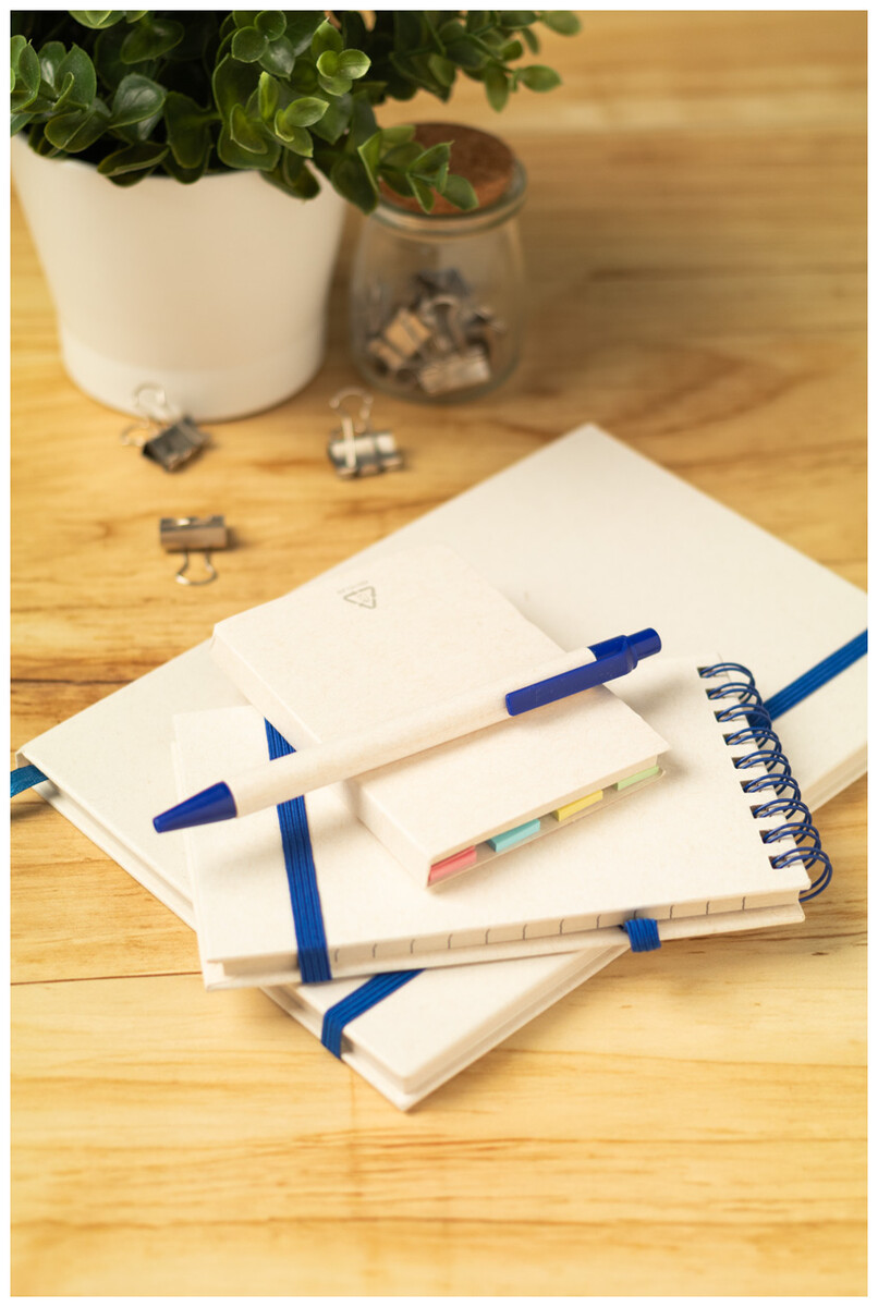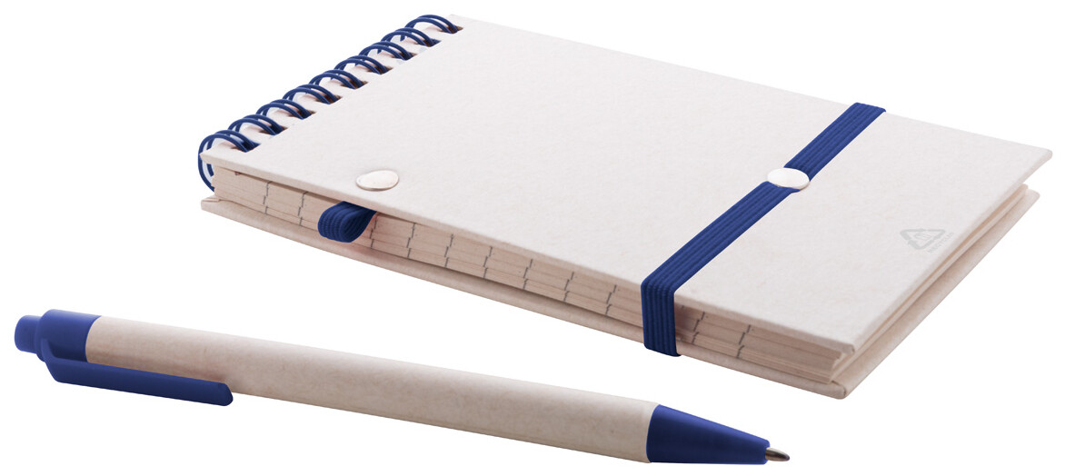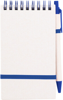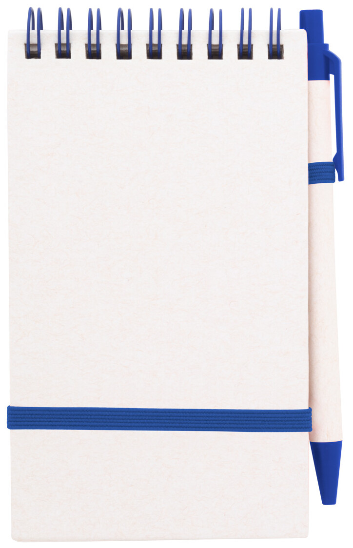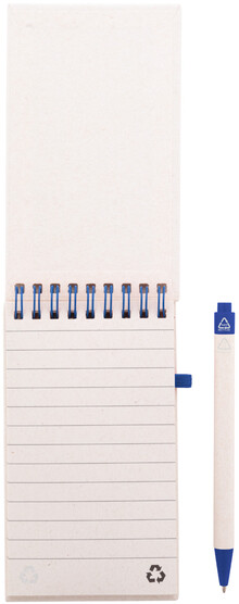 Spirálový blok A6 s deskami z recyklovaného z kartonu na mléko s pevnou vazbou a 70 linkovanými listy. Se spirálovými kroužky ve stejné barvě, gumičkou a poutkem na pero. Včetně recyklovaného kartonového papíru na mléko a recyklovaného ABS plastového kuličkového pera s modrou náplní.