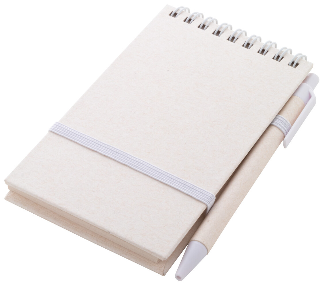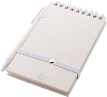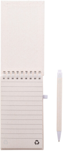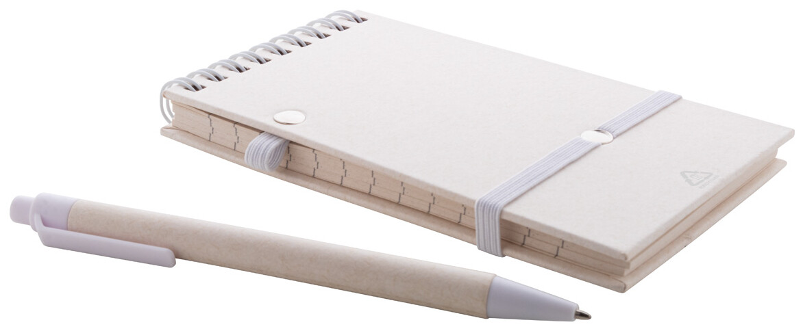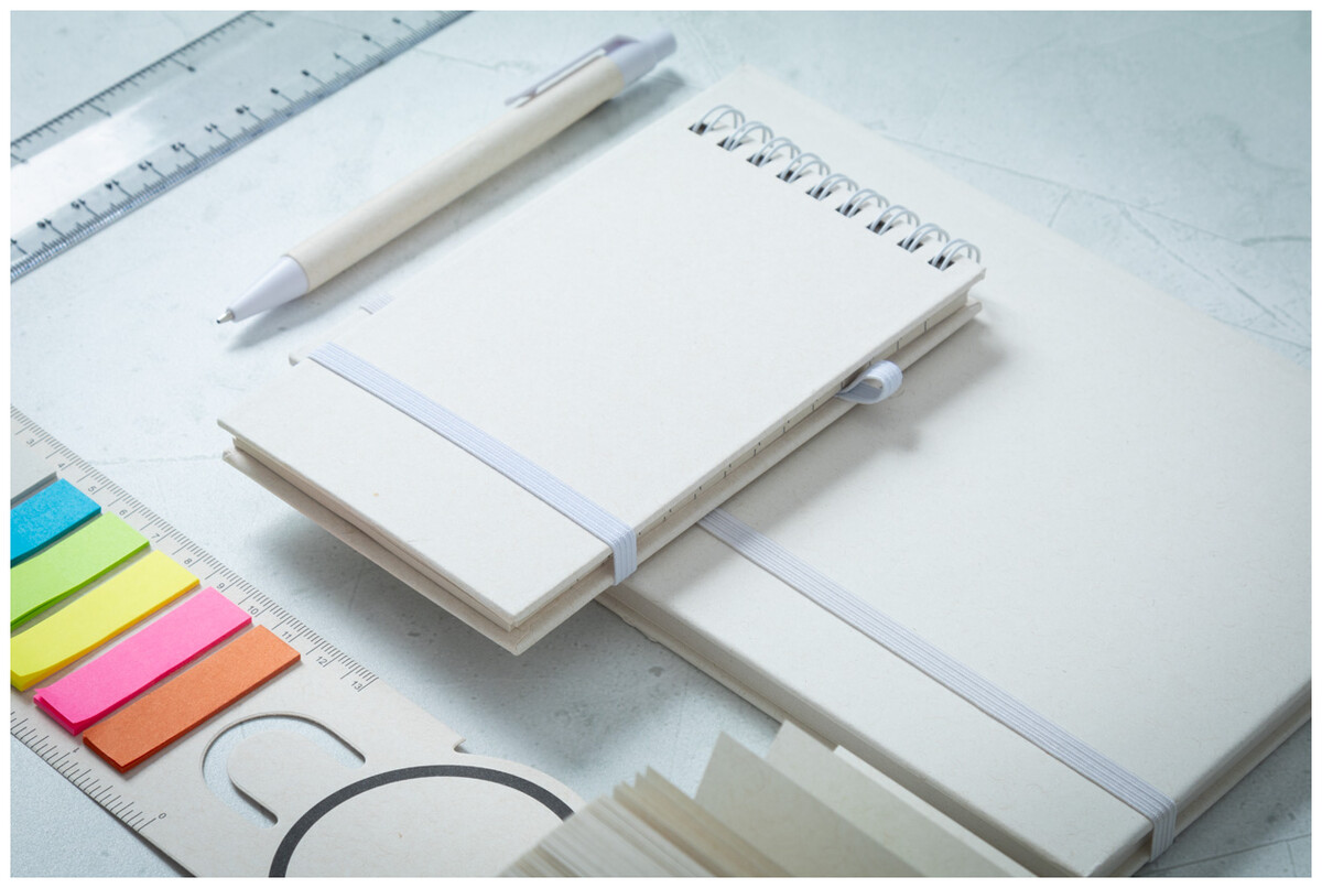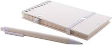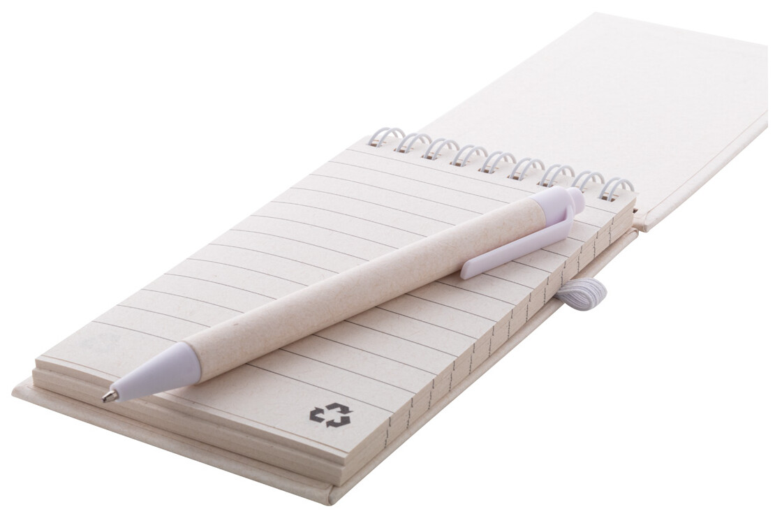 Spirálový blok A6 s deskami z recyklovaného z kartonu na mléko s pevnou vazbou a 70 linkovanými listy. Se spirálovými kroužky ve stejné barvě, gumičkou a poutkem na pero. Včetně recyklovaného kartonového papíru na mléko a recyklovaného ABS plastového kuličkového pera s modrou náplní.
