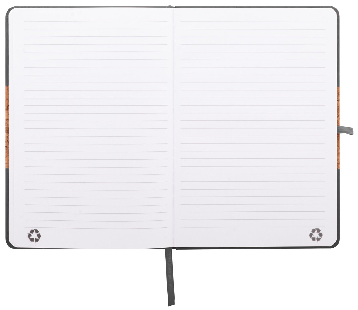 Blok A5 potažený přírodním korkem a recyklovanou PU kůží se záložkou v odpovídající barvě, gumičkou a držákem na pero. S 80 linkovanými listy z recyklovaného papíru.