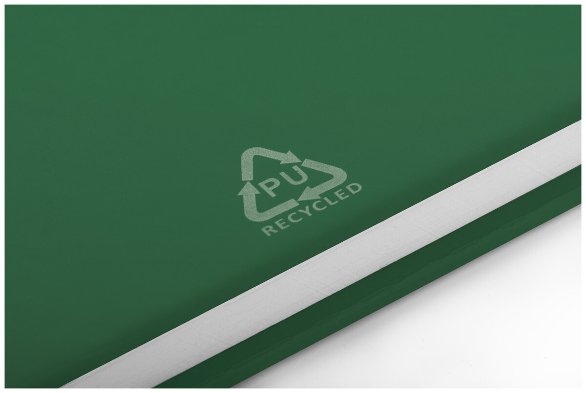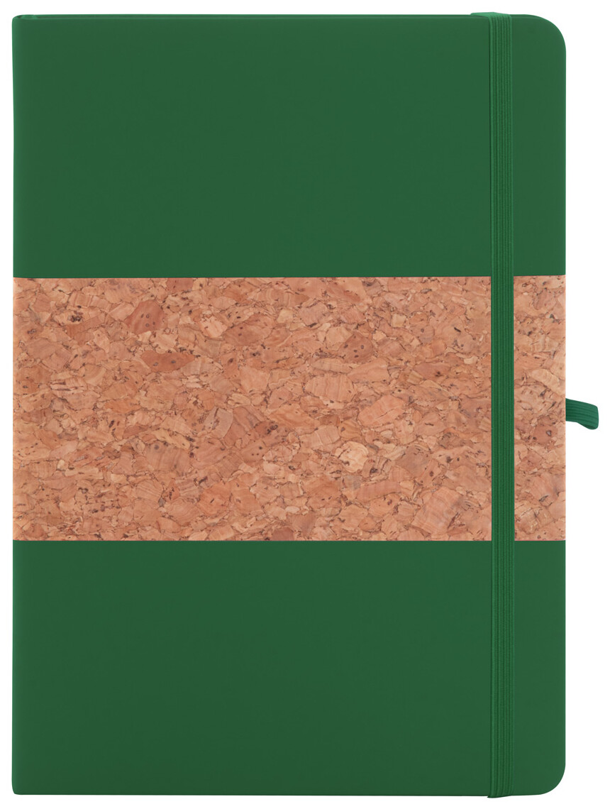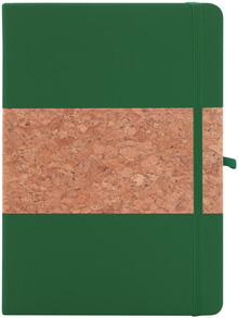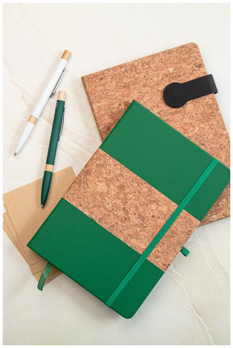 Blok A5 potažený přírodním korkem a recyklovanou PU kůží se záložkou v odpovídající barvě, gumičkou a držákem na pero. S 80 linkovanými listy z recyklovaného papíru.
