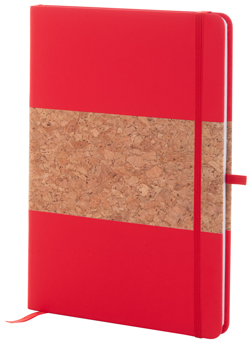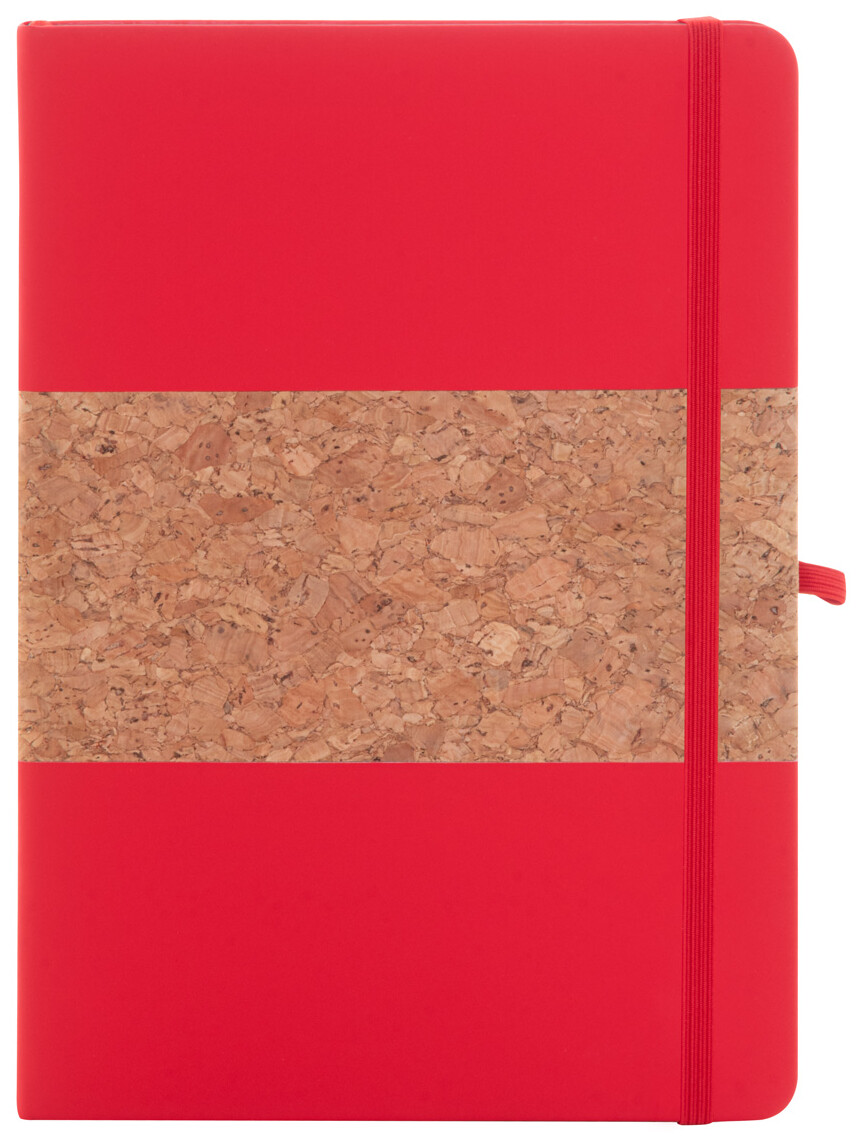 Blok A5 potažený přírodním korkem a recyklovanou PU kůží se záložkou v odpovídající barvě, gumičkou a držákem na pero. S 80 linkovanými listy z recyklovaného papíru.