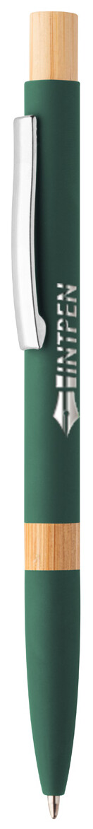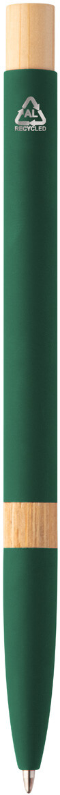 Kuličkové pero z recyklovaného hliníku s bambusovými částmi, pogumovaným povrchem a chromovým klipem. Se speciální vrstvou pro zrcadlové laserové gravírování. S modrou náplní.