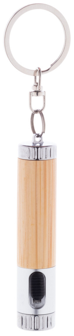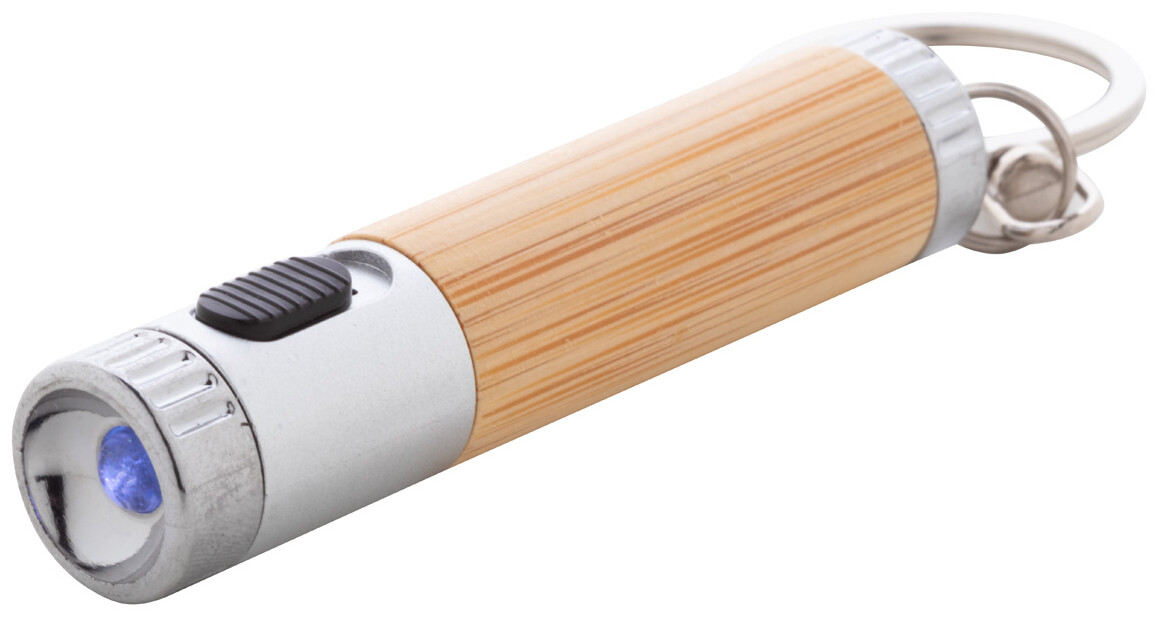 Mini svítilna z bambusu a recyklovaného ABS plastu s 1 LED a kovovým kroužkem na klíče. S knoflíkovou baterií.