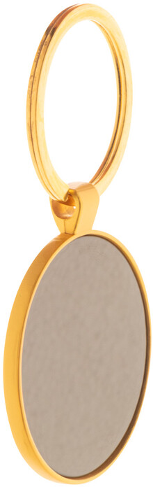 Kulatý kovový přívěsek na klíče ve zlatém provedení s bronzovým plátem. V kraftové papírové krabici.