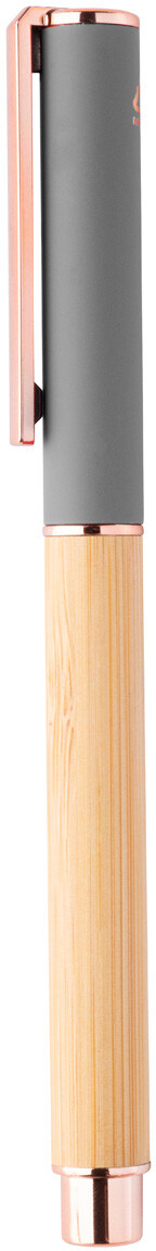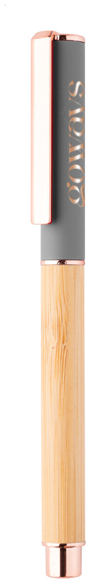 Roller pero z bambusu a recyklovaného hliníku s pogumovaným uzávěrem a detaily z růžového zlata. Se speciální povrchovou úpravou pro zrcadlové laserové gravírování v barvě růžového zlata. S modrou náplní.