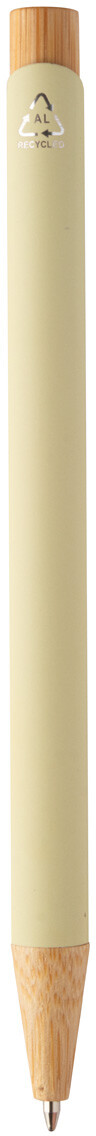 Kuličkové pero z recyklovaného hliníku s bambusovými částmi, pogumovaným povrchem a chromovým klipem. Se speciální vrstvou pro zrcadlové laserové gravírování. S modrou náplní.