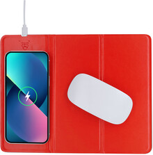 Skládací podložka pod myš z recyklované PU kůže s vestavěnou bezdrátovou nabíječkou (10W) a funkcí držáku mobilního telefonu. Se sametovou protiskluzovou základnou. Včetně USB nabíjecího kabelu.