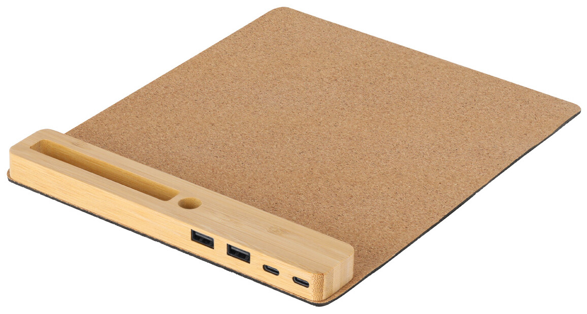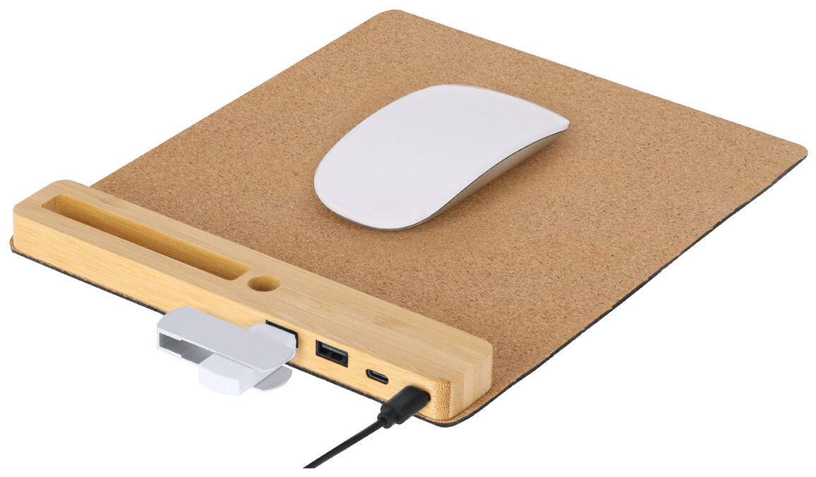 Přírodní korková podložka pod myš s bambusovým držákem na mobil a pero s vestavěným USB hubem se 2 USB a 1 USB-C portem, USB 2.0. S protiskluzovou silikonovou základnou.