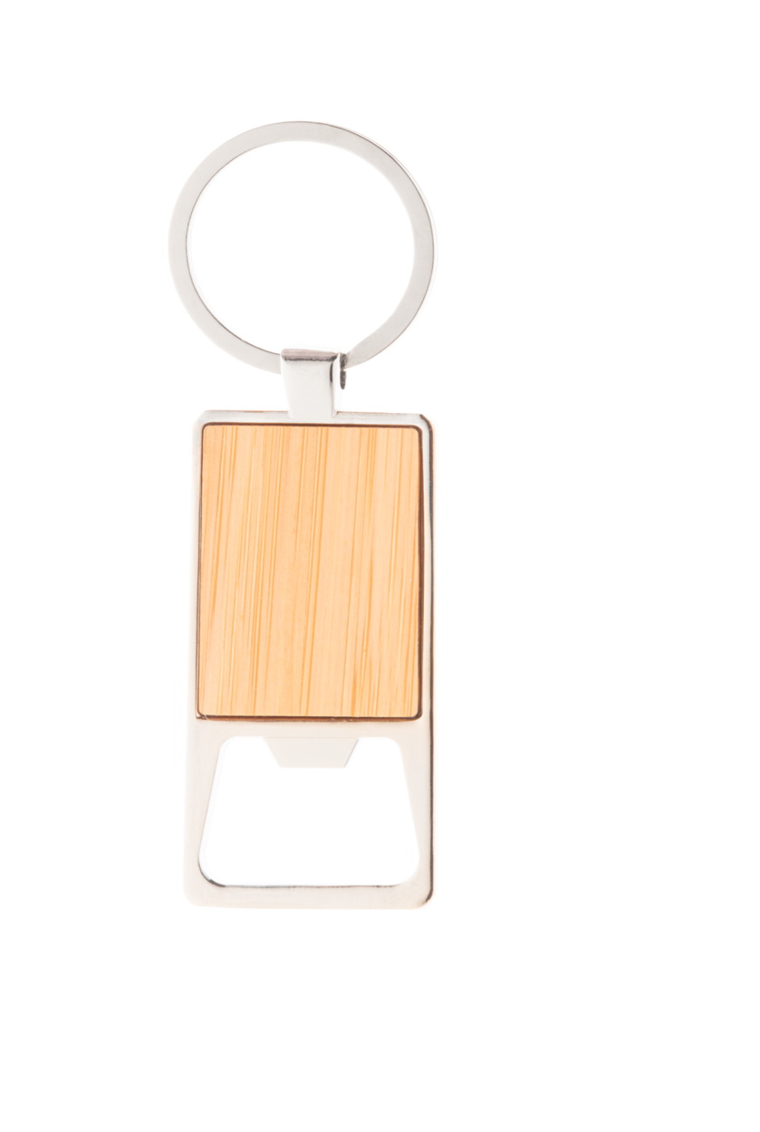 Kovový přívěsek na klíče s bambusovou vložkou a otvírákem na láhve.