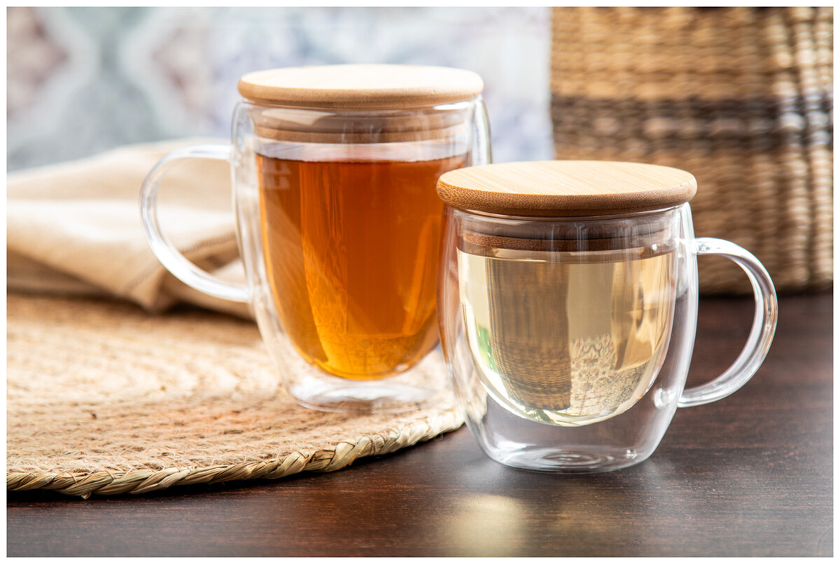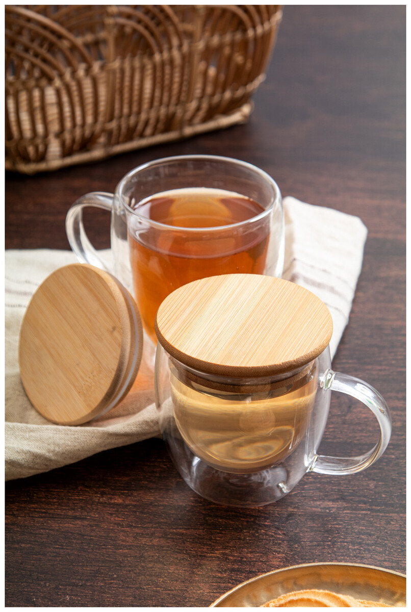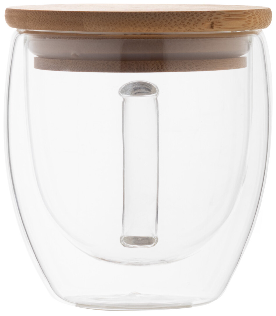 Dvoustěnný termo hrnek z borosilikátového skla s uchem a bambusovým víčkem, 250 ml. V kraftové papírové krabici.