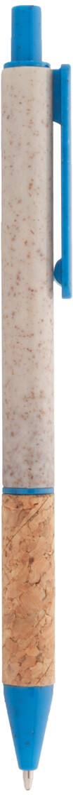 Ekologické plastové kuličkové pero z pšeničné slámy s přírodním korkem a barevnými částmi. S modrou náplní.