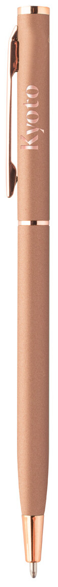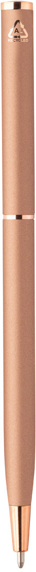 Kuličkové pero z recyklovaného hliníku s pogumovaným povrchem a detaily z růžového zlata. Se speciální povrchovou úpravou pro zrcadlové laserové gravírování v barvě růžového zlata. S modrou náplní.