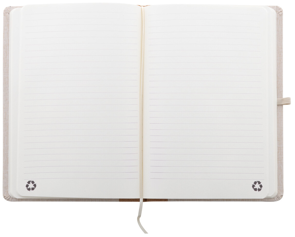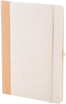 Blok A5 potažený polyesterem RPET s hřbetem z přírodního korku a 80 linkovanými listy z recyklovaného papíru. Se záložkou, gumovým páskem a držákem na pero.