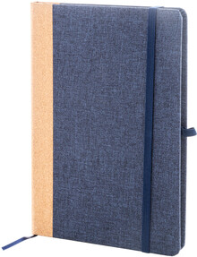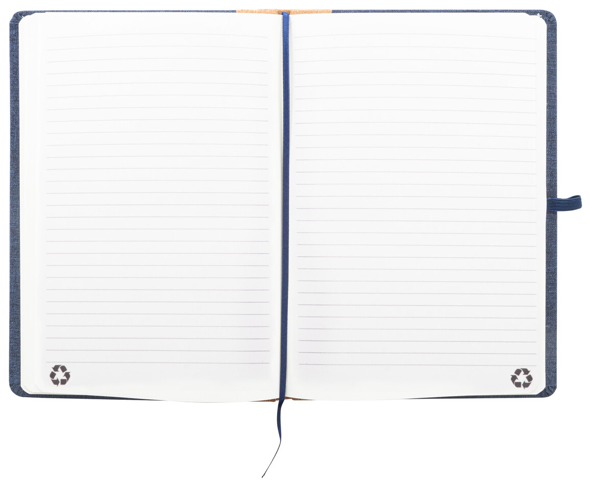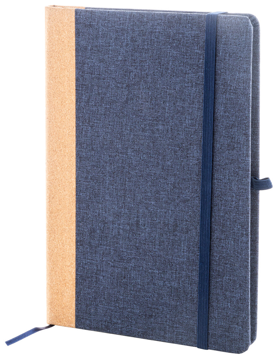 Blok A5 potažený polyesterem RPET s hřbetem z přírodního korku a 80 linkovanými listy z recyklovaného papíru. Se záložkou, gumovým páskem a držákem na pero.