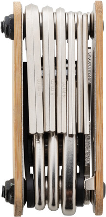 Multifunkční nářadí z nerezové oceli s bambusovou rukojetí a 14 funkcemi. Obsahuje ploché a křížové šroubováky, 5 šestihranných klíčů, 3 nástrčné klíče s prodlužovací lištou a 4 ploché klíče.