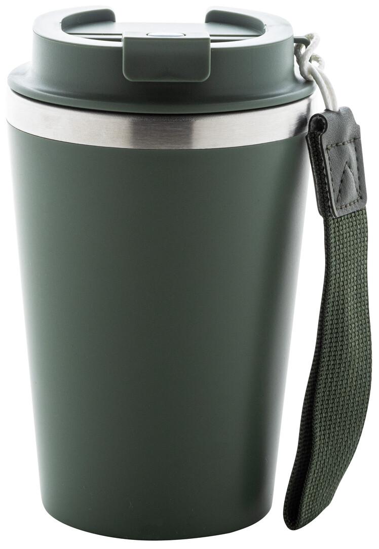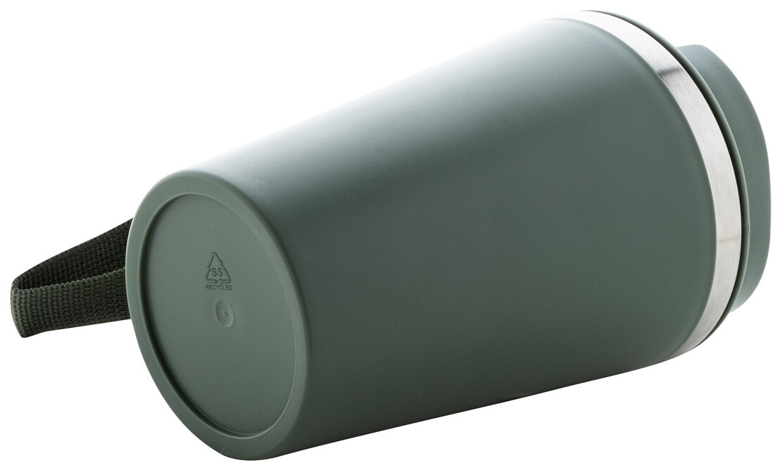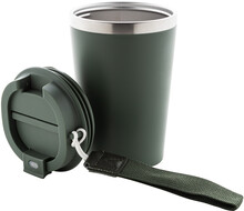 Dvoustěnný termo hrnek z recyklované nerezové oceli s vnějším PP plastem a víčkem na pití. S popruhem na přenášení RPET. 350 ml.