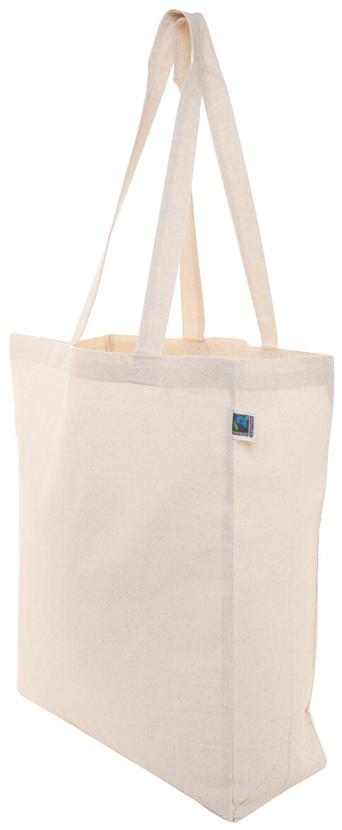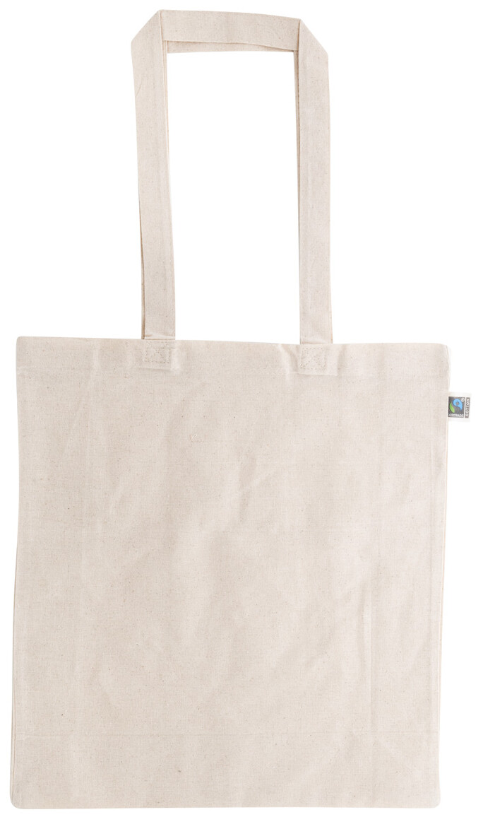 Opakovaně použitelná bavlněná nákupní taška Fairtrade s klínem a dlouhými uchy. 100% fairtradová bavlna, 180 g/m2. S výraznou etiketou Fairtrade.