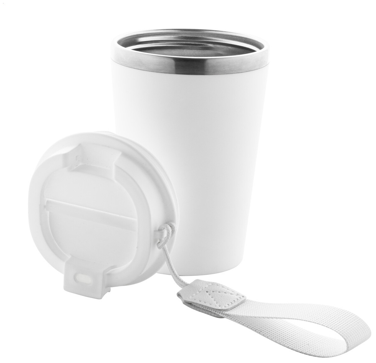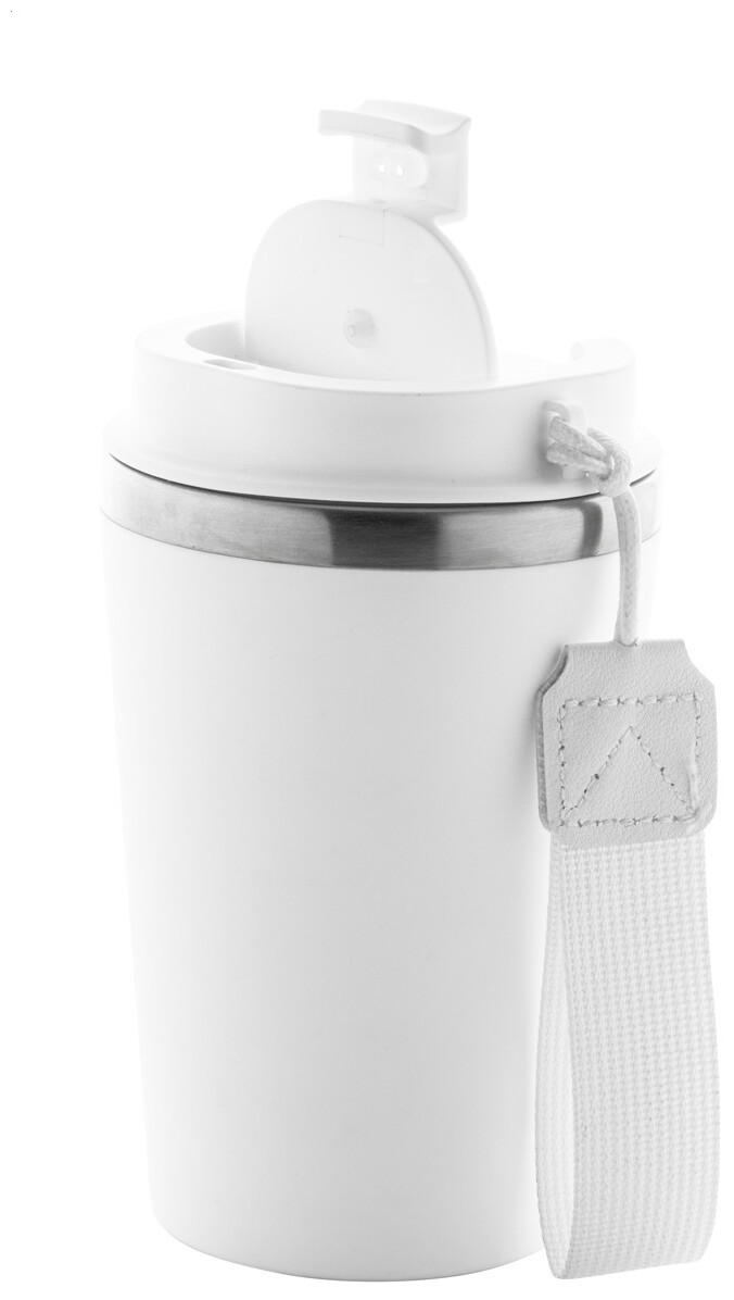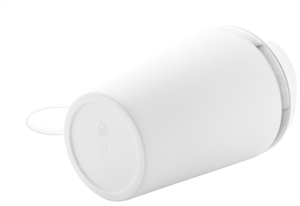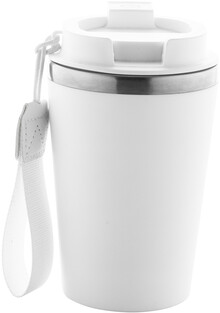 Dvoustěnný termo hrnek z recyklované nerezové oceli s vnějším PP plastem a víčkem na pití. S popruhem na přenášení RPET. 350 ml.