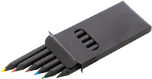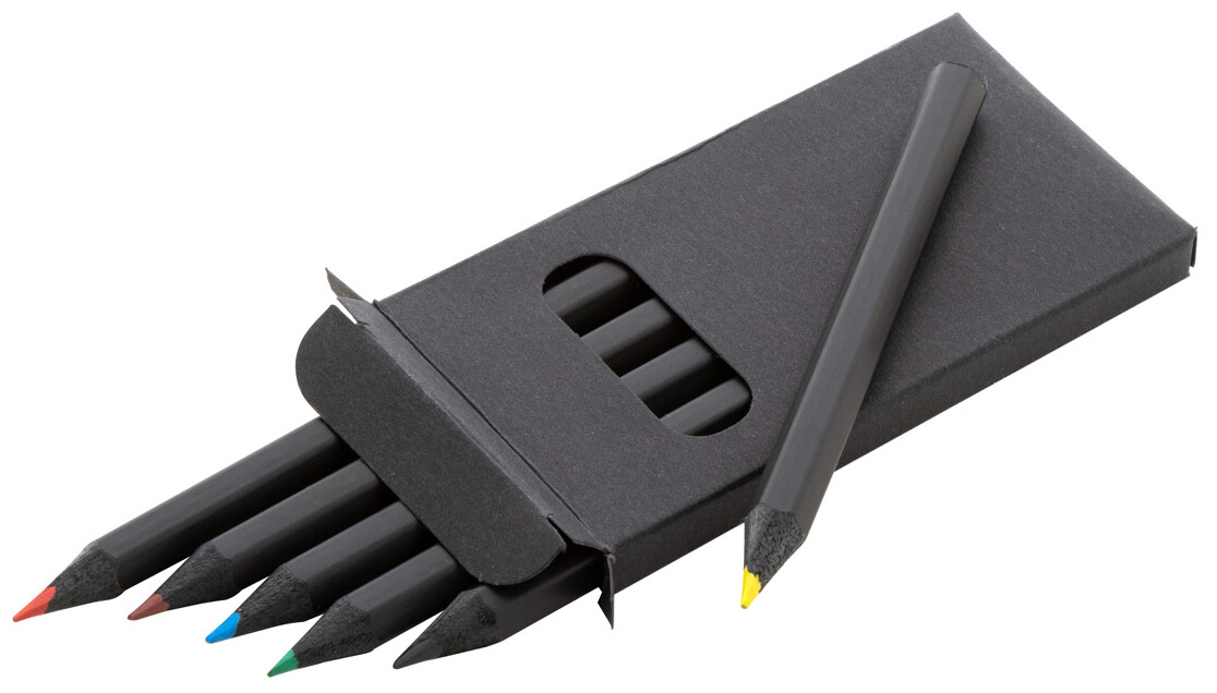 6dílná sada pastelek z černého dřeva v černé krabičce z papíru.