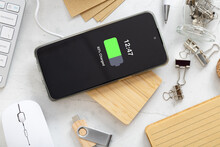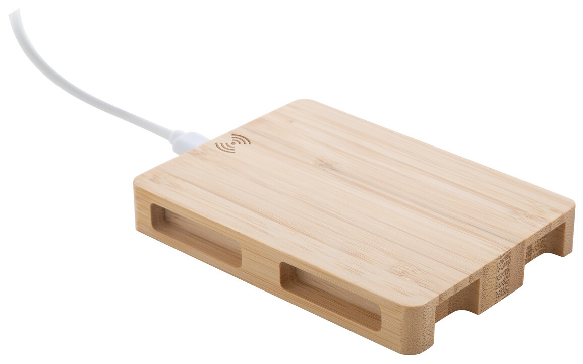 Bezdrátová rychlonabíječka (10W) v bambusovém pouzdře ve tvaru palety. Včetně USB nabíjecího kabelu.