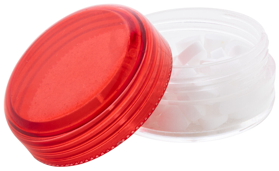 Kulatá průhledná plastová dóza s mintovými bonbóny s barevným šroubovacím víčkem. Obsahující cca. 12 gramů mentolových bonbonů bez cukru.