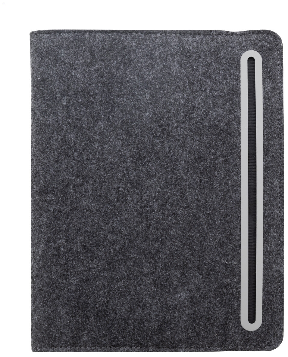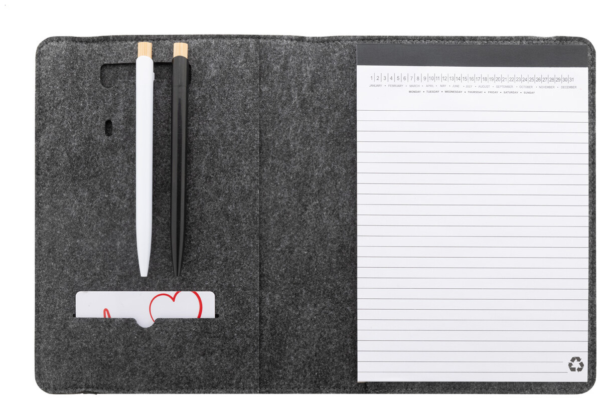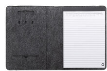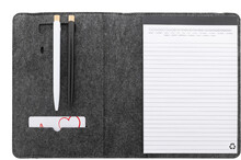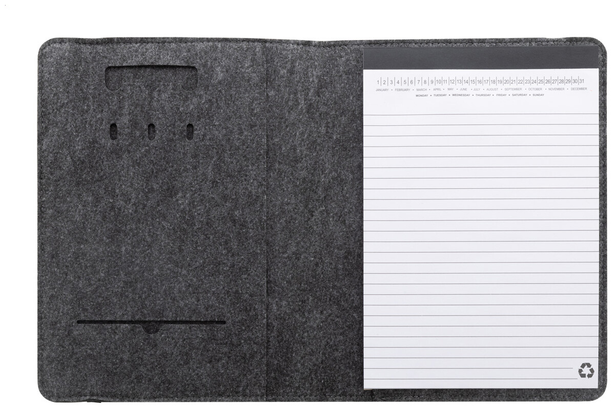 Plstěná sloha A5 na dokumenty z RPET formátu A5 s předními a několika vnitřními kapsami s organizérem. S 20 linkovanými listy poznámkového bloku z recyklovaného papíru.
