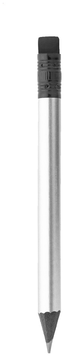 Černá dřevěná mini tužka v metalickém provedení s černou gumou. Ořezaná, třída HB.