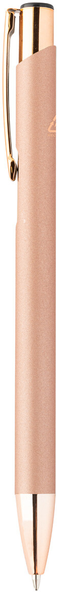 Kuličkové pero z recyklovaného hliníku s pogumovaným povrchem a detaily v barvě růžového zlata. Se speciální povrchovou úpravou pro zrcadlové laserové gravírování v barvě růžového zlata. S modrou náplní.