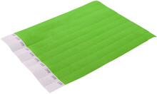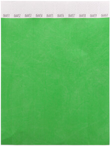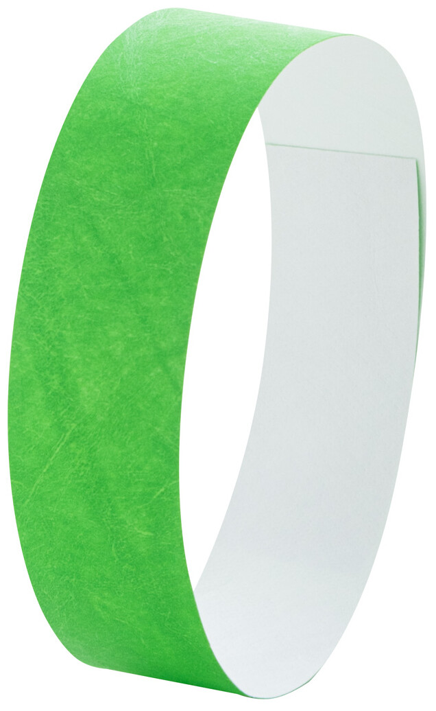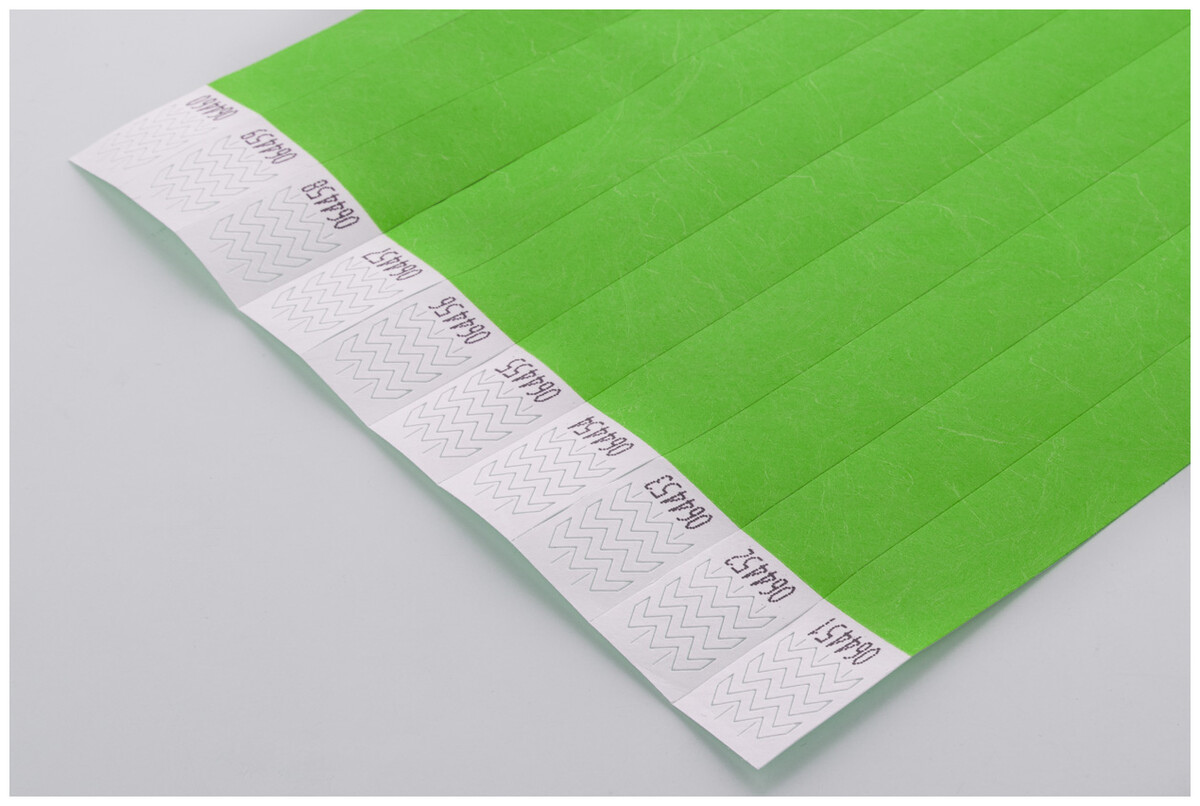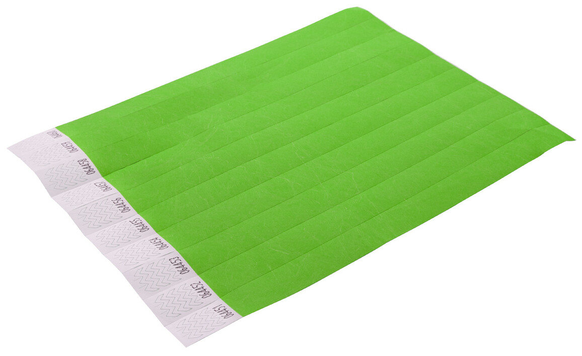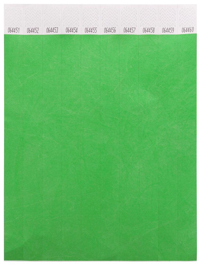 Jeden arch 19 mm širokých tyvekových náramků (10 ks) s lepicím bezpečnostním uzávěrem a jedinečným číslováním.
