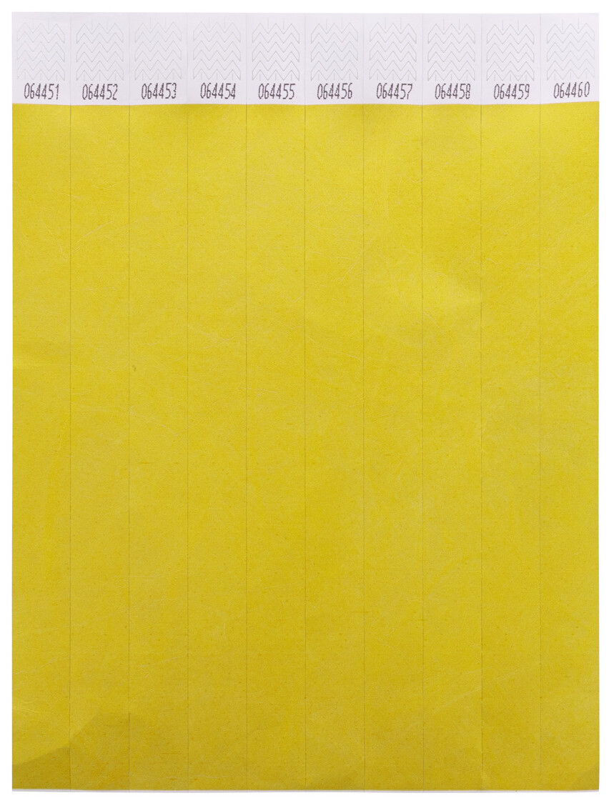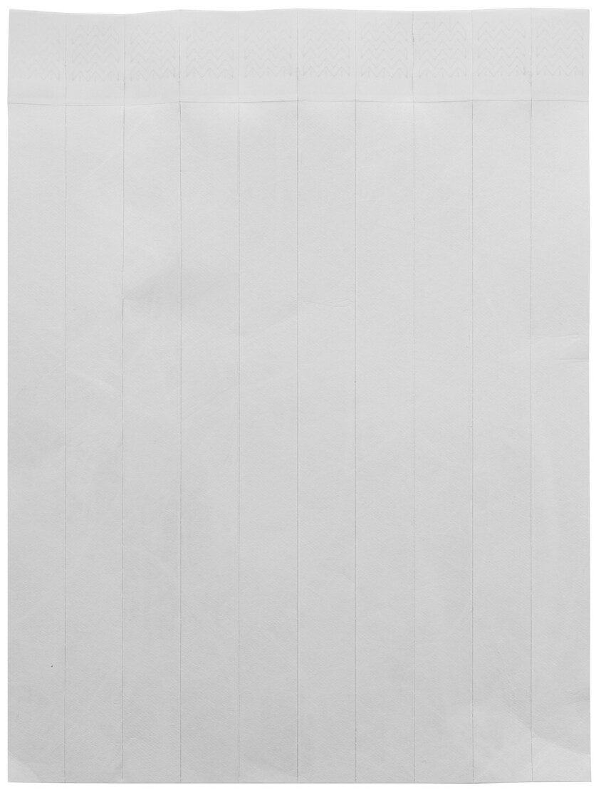 Jeden arch 19 mm širokých tyvekových náramků (10 ks) s lepicím bezpečnostním uzávěrem a jedinečným číslováním.