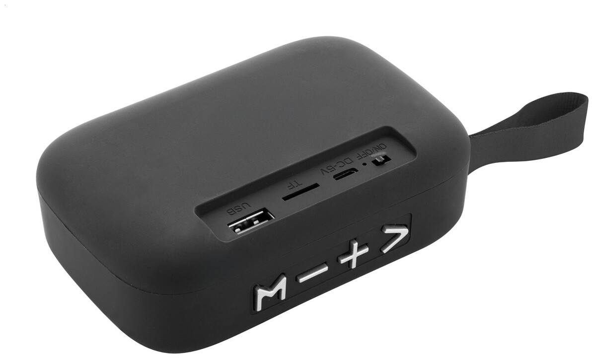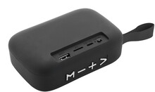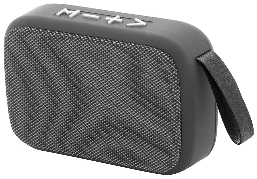 Bezdrátový reproduktor v plastovém krytu s polyesterovou tkaninou a vestavěnou dobíjecí baterií (250 mAh). Včetně nabíjecího kabelu USB.