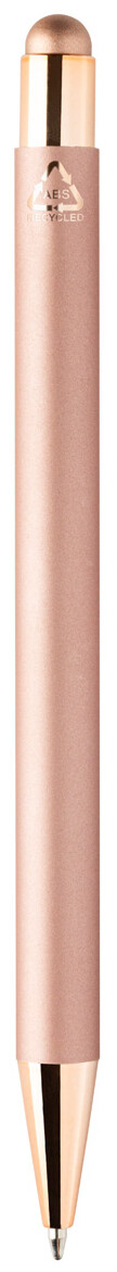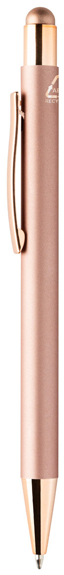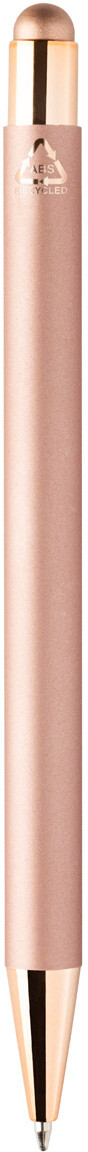 Recyklované hliníkové kuličkové a dotykové pero s pogumovaným tělem a barevnými lesklými kovovými částmi. Se speciální vrstvou pro zrcadlové gravírování odpovídající kovovým částem. S modrou náplní.