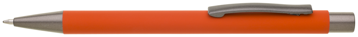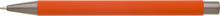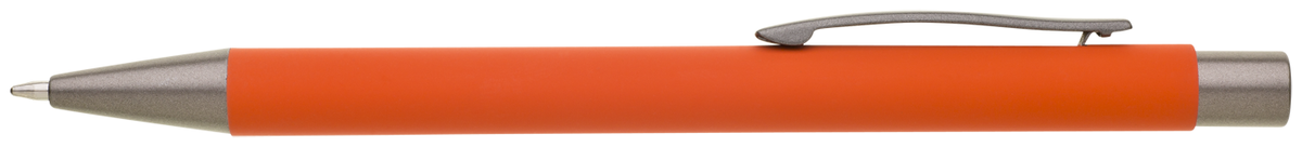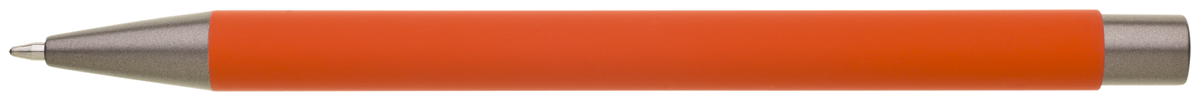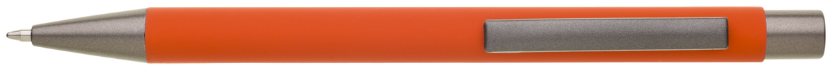 Kovová propiska CAGERI SOFT s hnědo-černými doplňky, s oranžovým pogumovaným povrchem. Velkoobsahová modrá náplň.