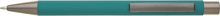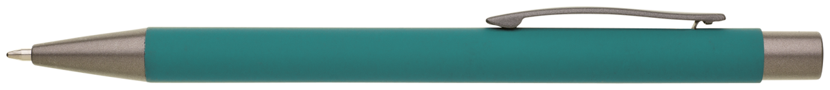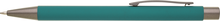Kovová propiska CAGERI SOFT s hnědo-černými doplňky, s tyrkysovým pogumovaným povrchem. Velkoobsahová modrá náplň.