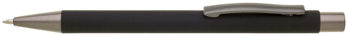 Kovová propiska CAGERI SOFT s hnědo-černými doplňky, s černým pogumovaným povrchem. Velkoobsahová modrá náplň.