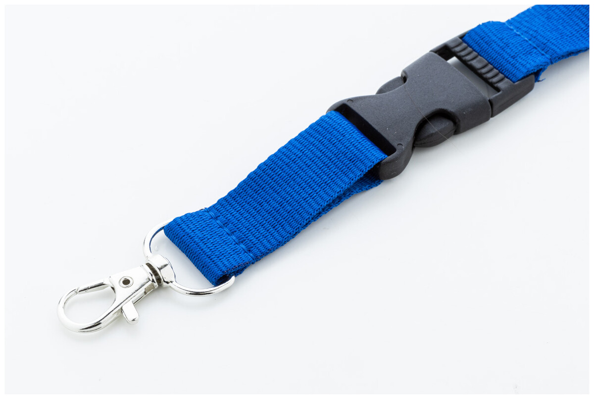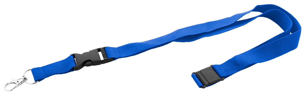 Polyesterový lanyard RPET s odnímatelnou kovovou karabinou a bezpečnostní přezkou.