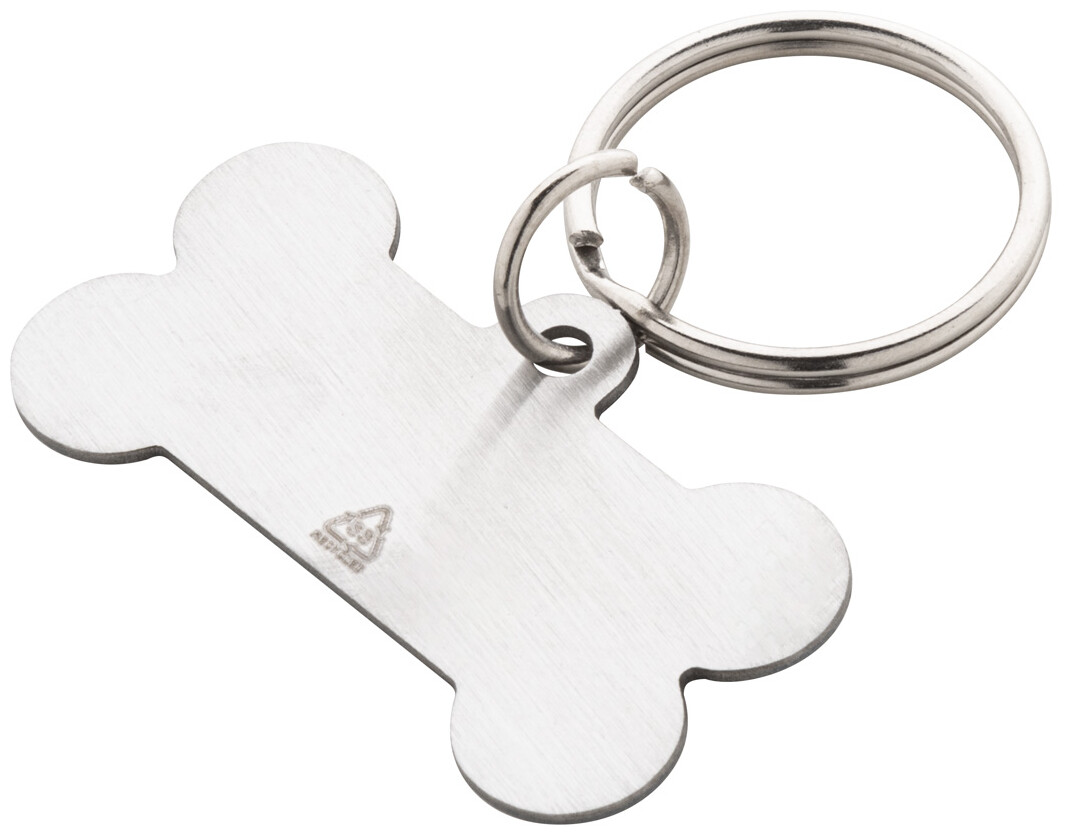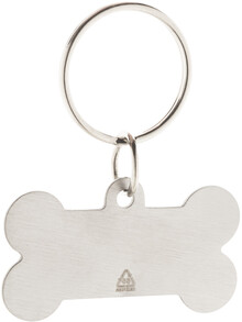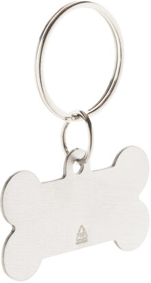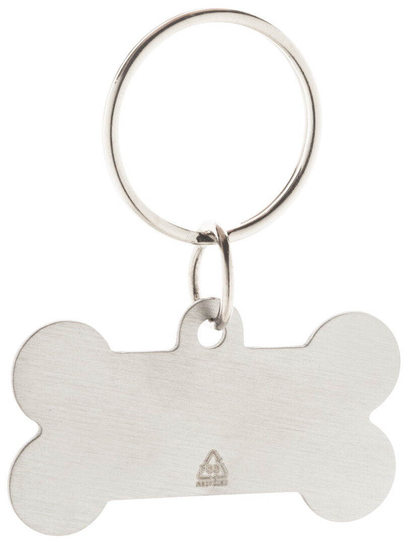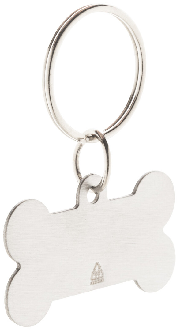 Psí známka z recyklované nerezové oceli ve tvaru kosti s kroužkem na klíče.