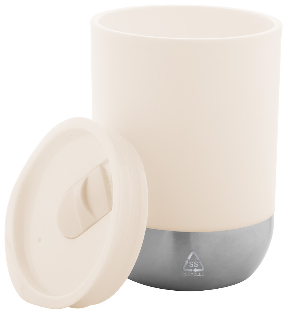 Dvoustěnný termo hrnek s PP plastovou izolací se dnem z recyklované nerezové oceli a víčkem na pití. 300 ml.