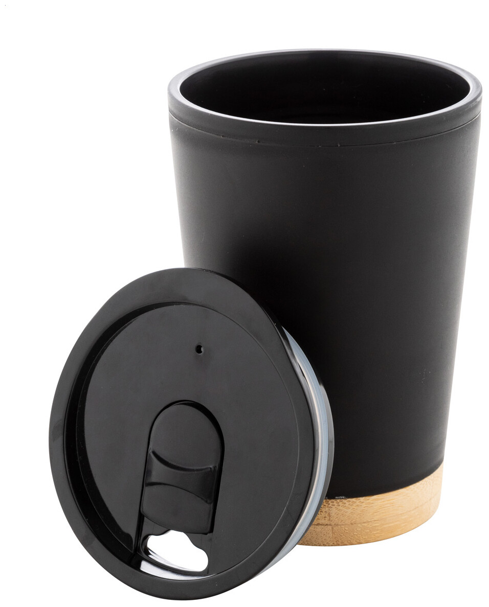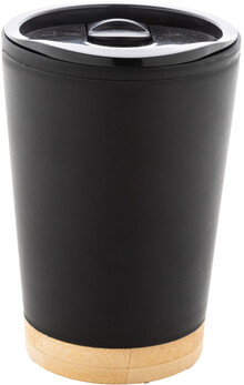 Dvoustěnný termo hrnek izolovaný PP plastem s víčkem na pití a bambusovým dnem, 260 ml.