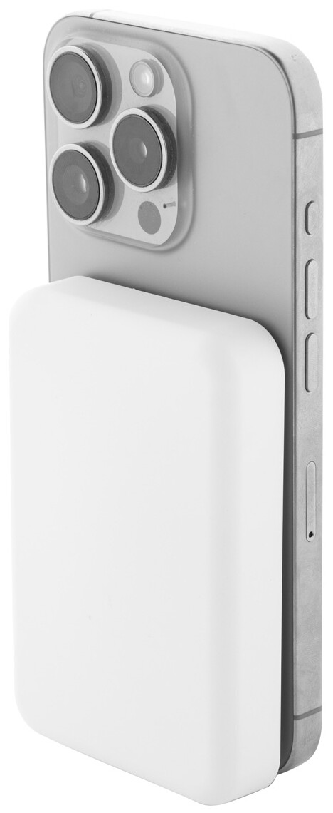 Power banka z recyklovaného ABS s 5000 mAh baterií a vestavěnou magnetickou bezdrátovou nabíječkou (5W). Se vstupem USB-C a portem pro nabíječku. Včetně samolepícího kovového kroužku pro použití magnetické funkce na jakémkoli bezdrátově nabíjecím zařízení. Kompatibilní s iPhone® 12 nebo novějším. Včetně USB nabíjecího kabelu.