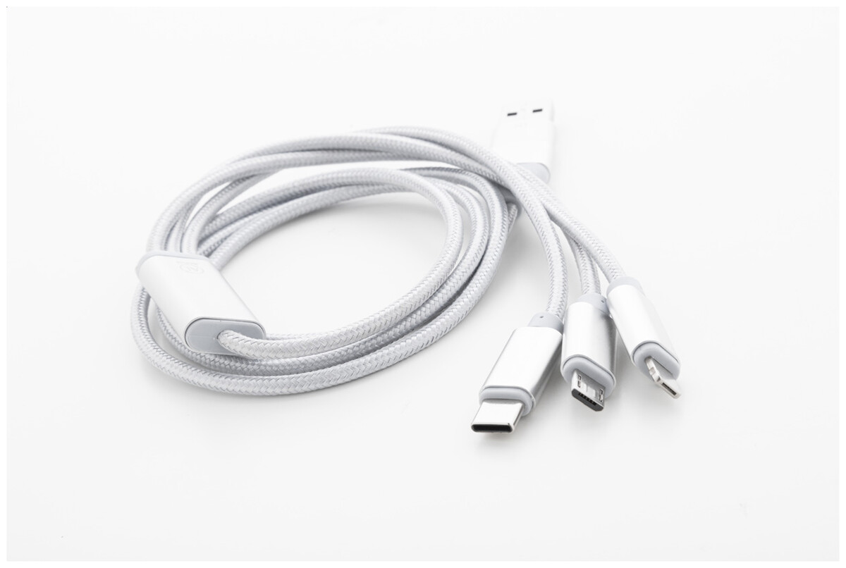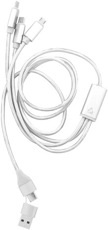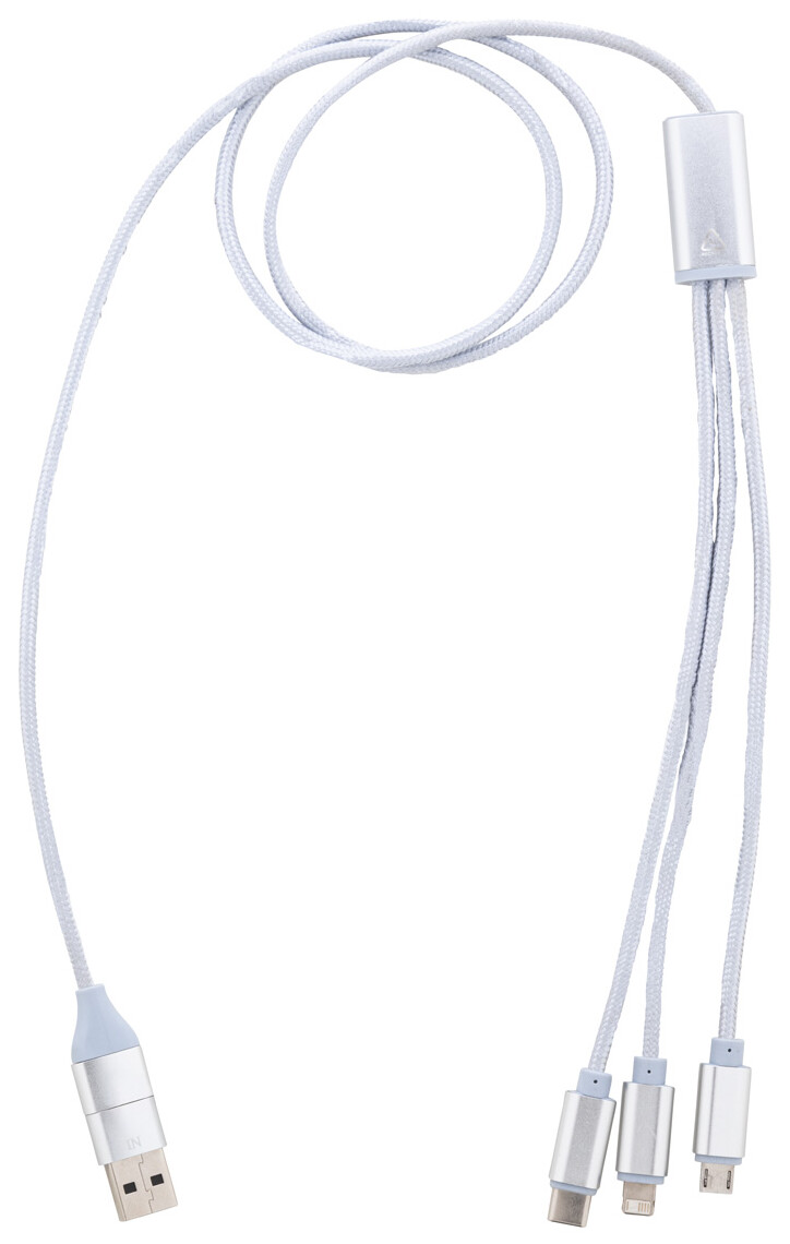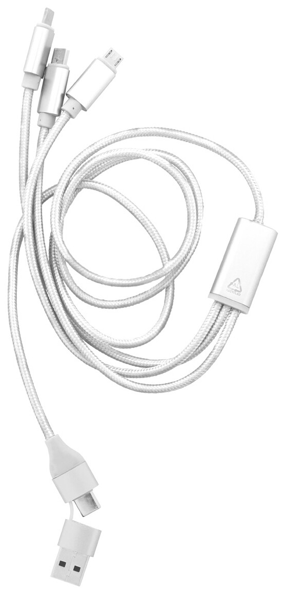USB nabíjecí kabel z recyklovaného hliníku a RPET s konektory micro USB, USB-C a Lightning. Se vstupy USB a USB-C. Délka kabelu: 100 cm.